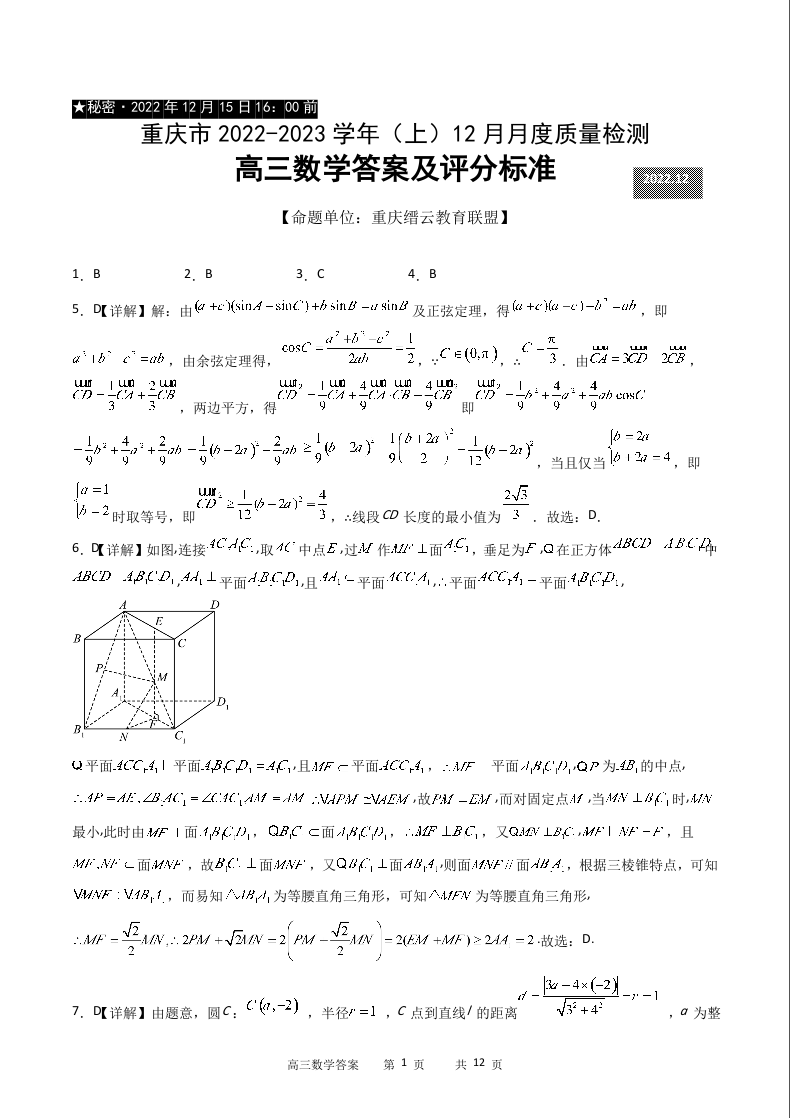 高三数学答案--重庆市缙云教育联盟2022-2023学年高三上学期12月质量监测