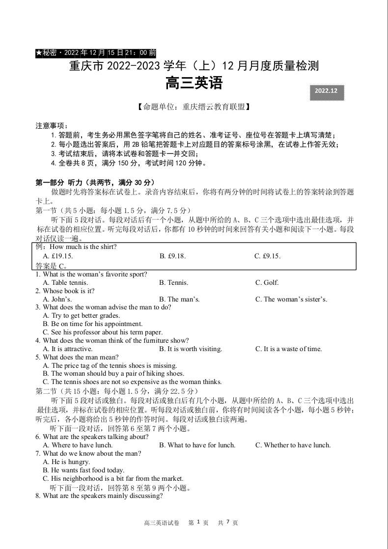 高三英语--重庆市缙云教育联盟2022-2023学年高三上学期12月质量监测