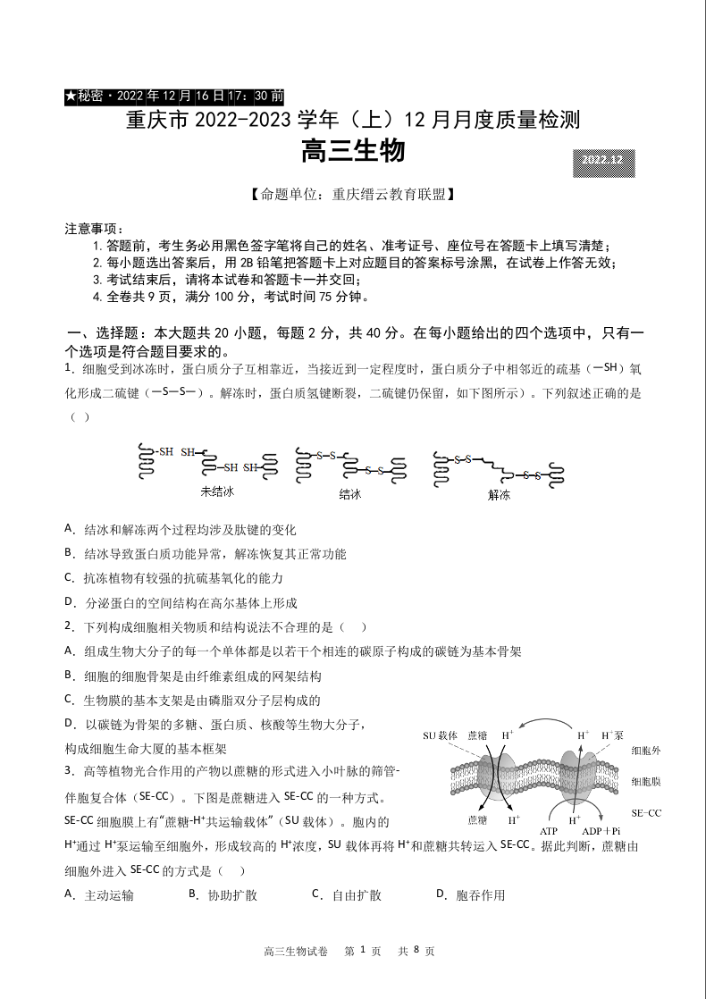 高三生物--重庆市缙云教育联盟2022-2023学年高三上学期12月质量监测