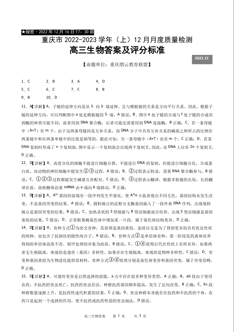 高三生物答案--重庆市缙云教育联盟2022-2023学年高三上学期12月质量监测