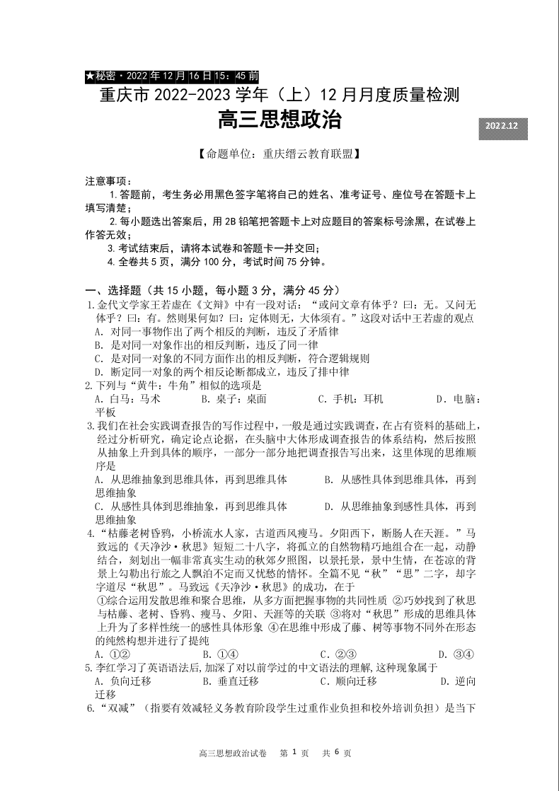 高三政治--重庆市缙云教育联盟2022-2023学年高三上学期12月质量监测