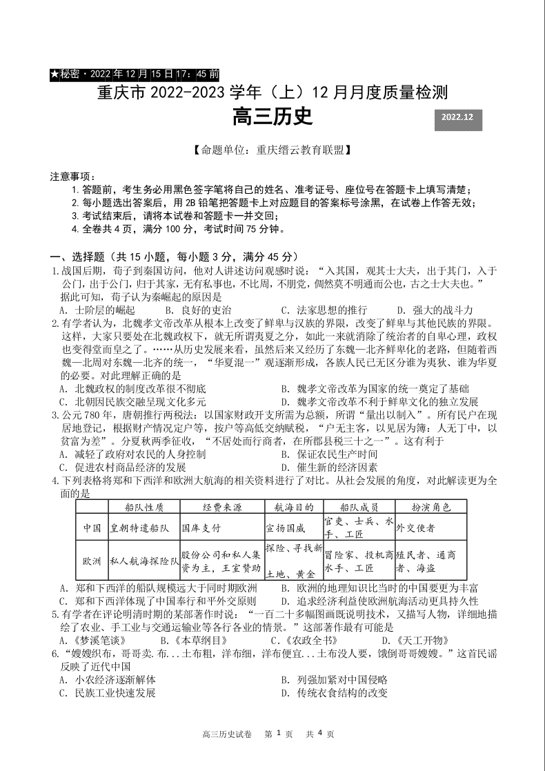 高三历史--重庆市缙云教育联盟2022-2023学年高三上学期12月质量监测
