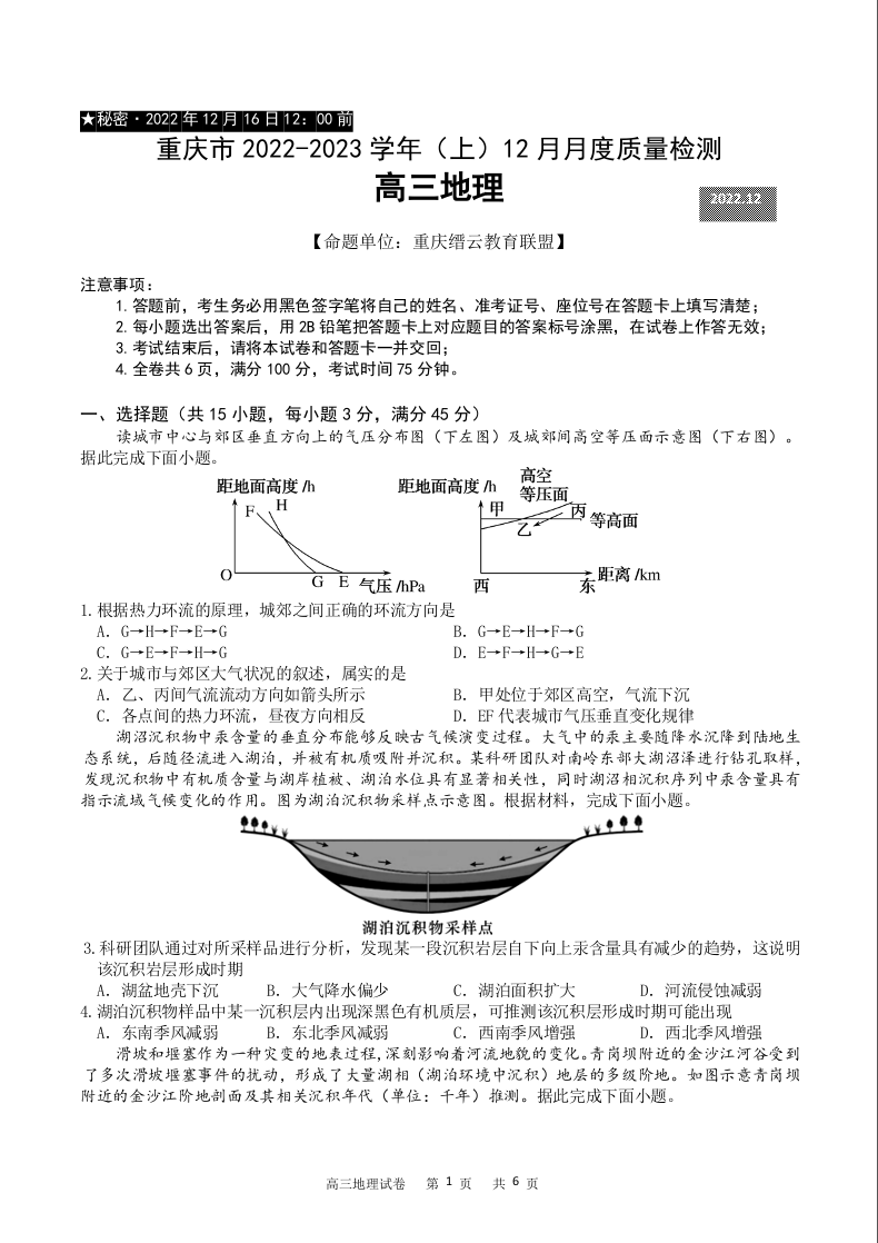 高三地理--重庆市缙云教育联盟2022-2023学年高三上学期12月质量监测