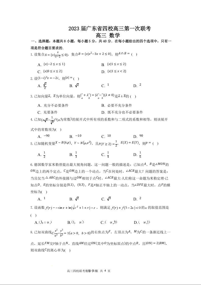 高三数学-广东省四校 (深圳中学,华师附中,省实验,广雅)2023届高三上学期第一次联考