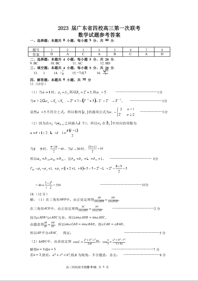 高三数学答案-广东省四校 (深圳中学,华师附中,省实验,广雅)2023届高三上学期第一次联考