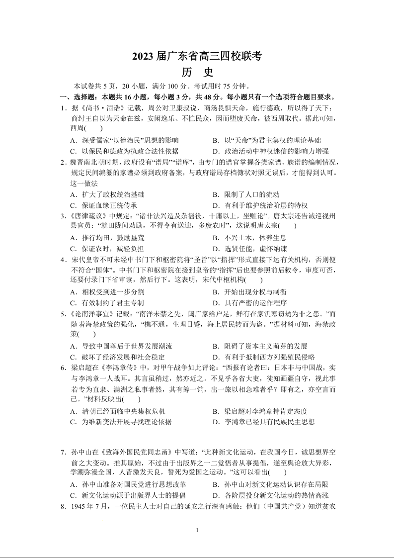 高三历史+答案-广东省四校 (深圳中学,华师附中,省实验,广雅)2023届高三上学期第一次联考