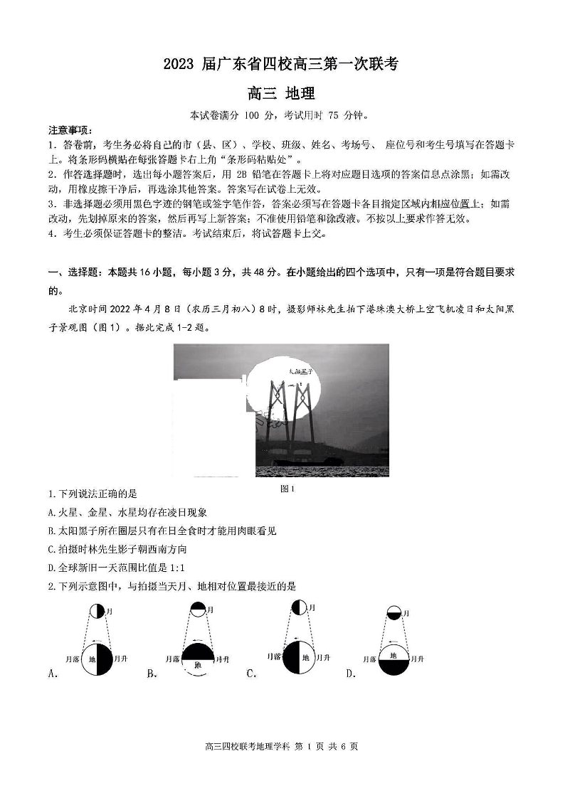 高三地理-广东省四校 (深圳中学,华师附中,省实验,广雅)2023届高三上学期第一次联考