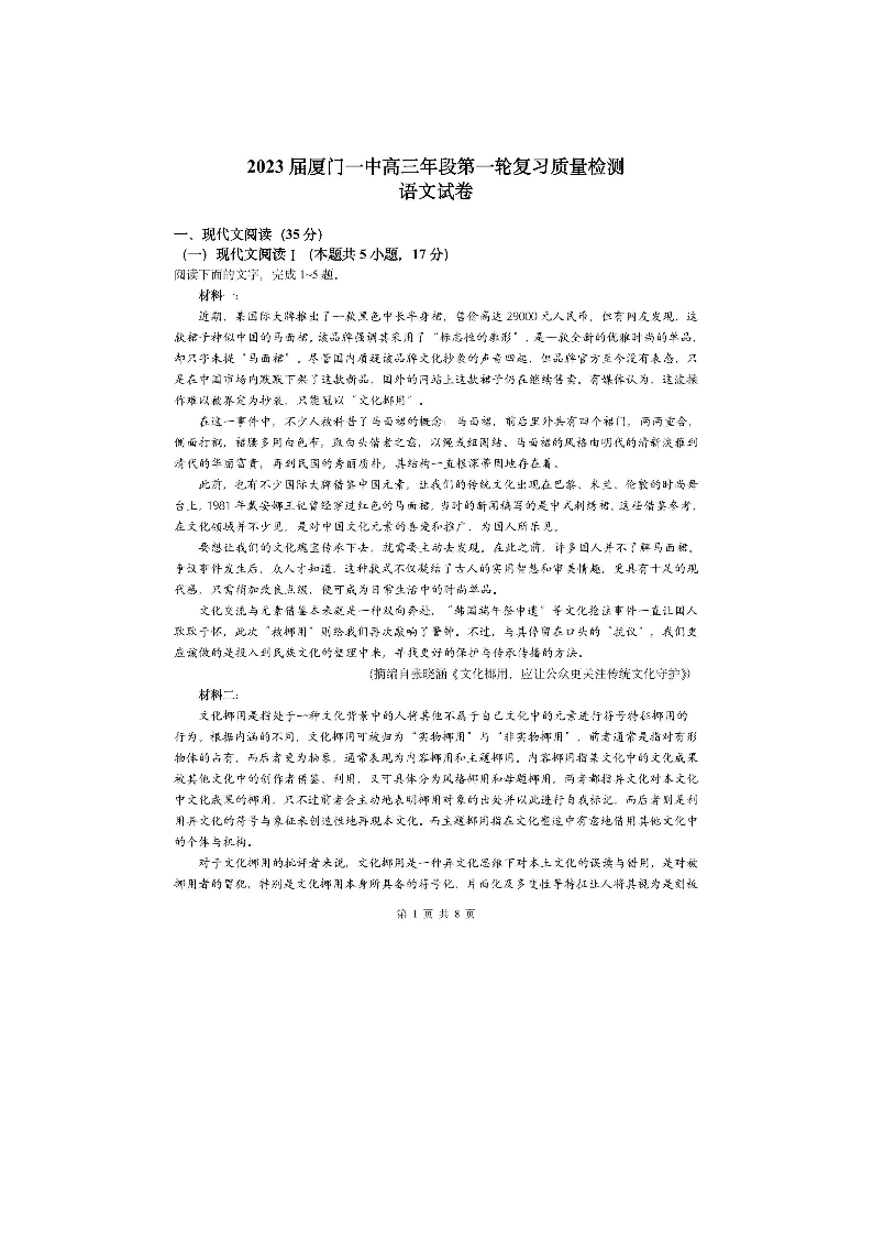 高三语文+答案-福建省厦门第一中学2022-2023学年高三上学期12月月考
