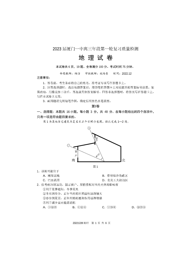 高三地理+答案-福建省厦门第一中学2022-2023学年高三上学期12月月考