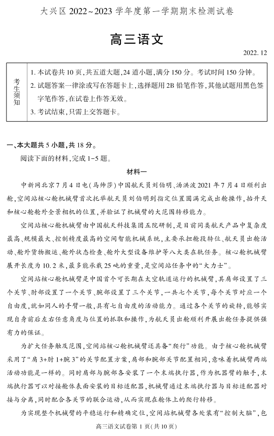 高三语文-北京市大兴区2023届高三上学期期末检测