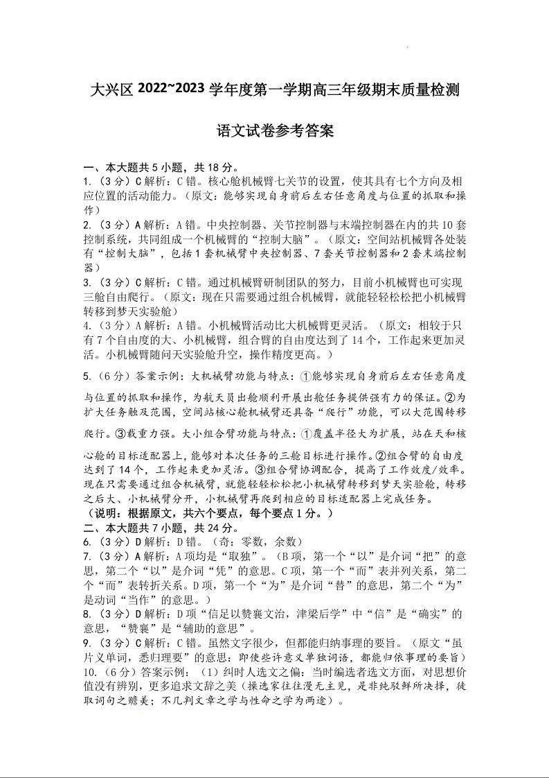高三语文答案-北京市大兴区2023届高三上学期期末检测