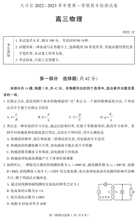 高三物理-北京市大兴区2023届高三上学期期末检测