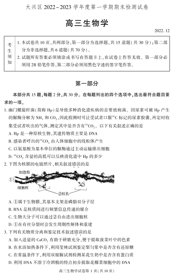 高三生物-北京市大兴区2023届高三上学期期末检测