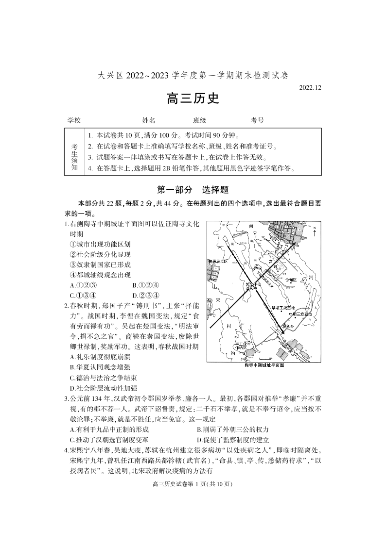 高三历史-北京市大兴区2023届高三上学期期末检测