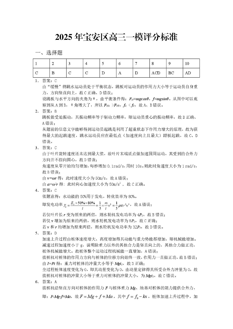 高三物理答案--广东省深圳市宝安区2026届高三上学期10月教学质量检测