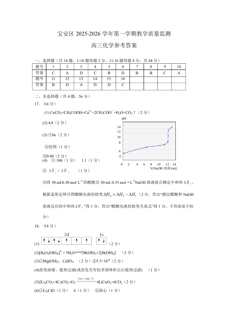 高三化学答案--广东省深圳市宝安区2026届高三上学期10月教学质量检测