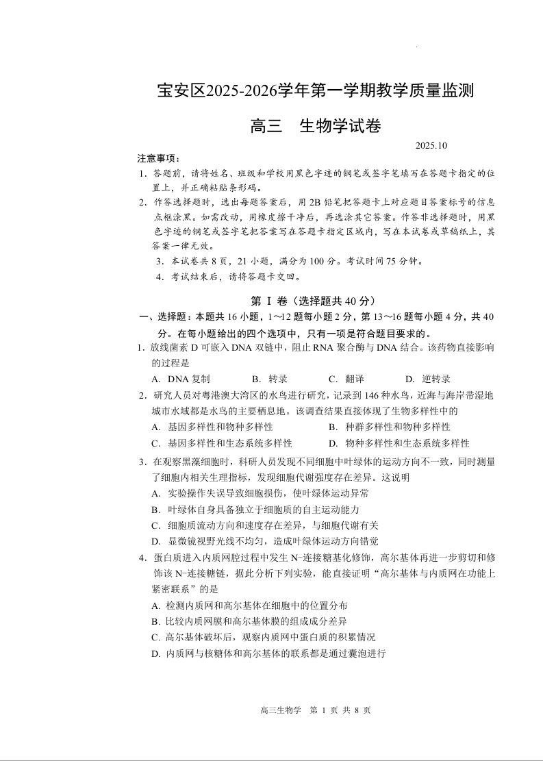 高三生物--广东省深圳市宝安区2026届高三上学期10月教学质量检测