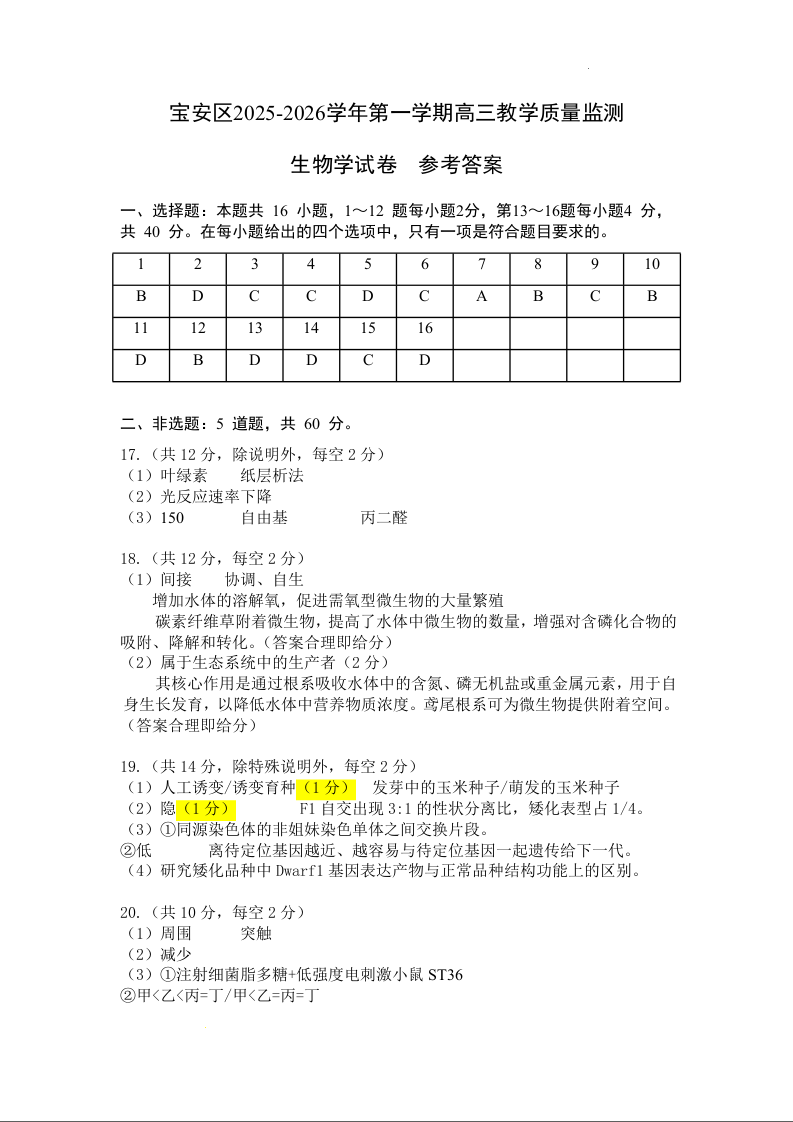 高三生物答案--广东省深圳市宝安区2026届高三上学期10月教学质量检测