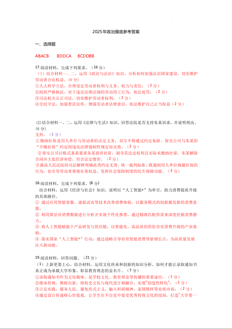 高三政治答案--广东省深圳市宝安区2026届高三上学期10月教学质量检测