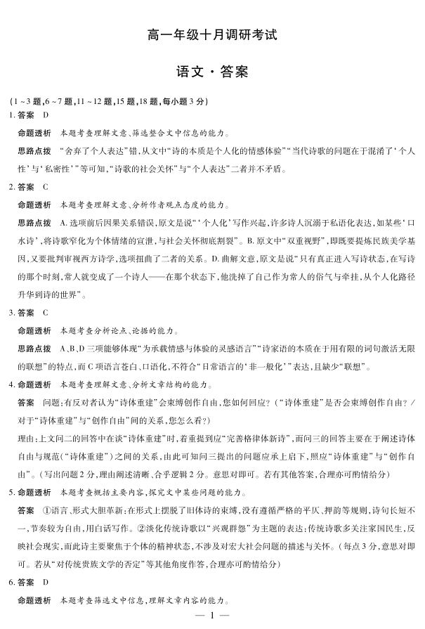高一语文答案-安徽省天一大联考2025-2026学年上学期高一年级10月调研考试