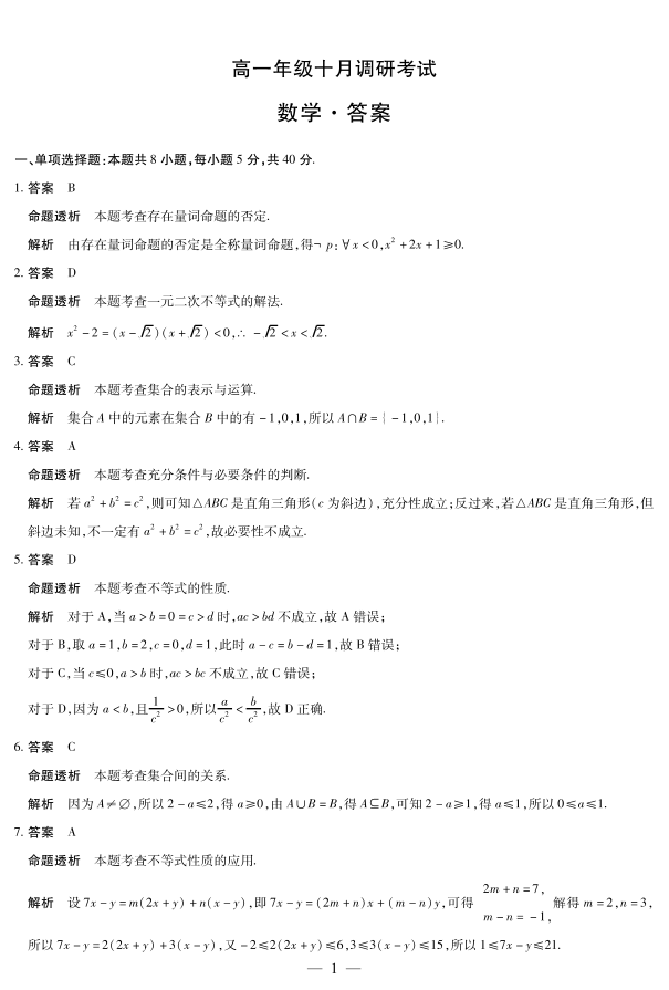 高一数学答案--安徽省天一大联考2025-2026学年上学期高一年级10月调研考试