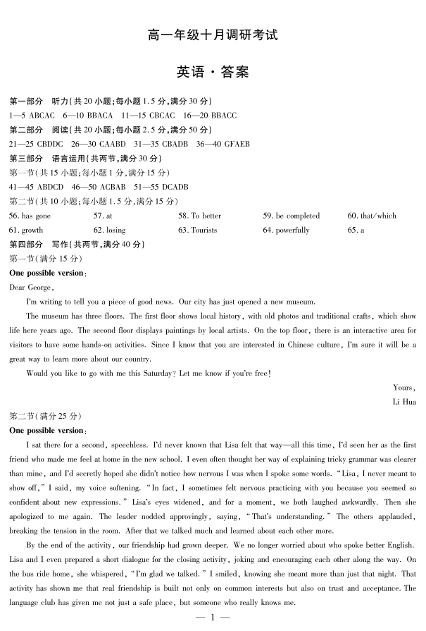 高一英语答案-安徽省天一大联考2025-2026学年上学期高一年级10月调研考试