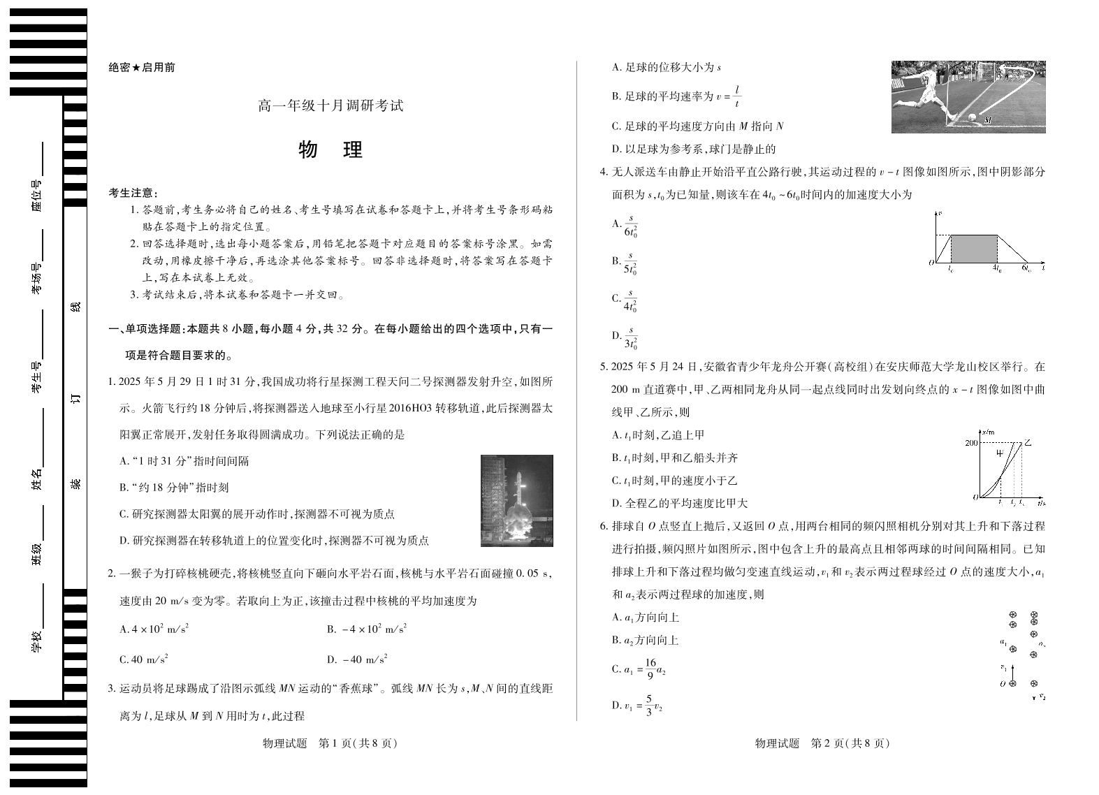 高一物理-安徽省天一大联考2025-2026学年上学期高一年级10月调研考试