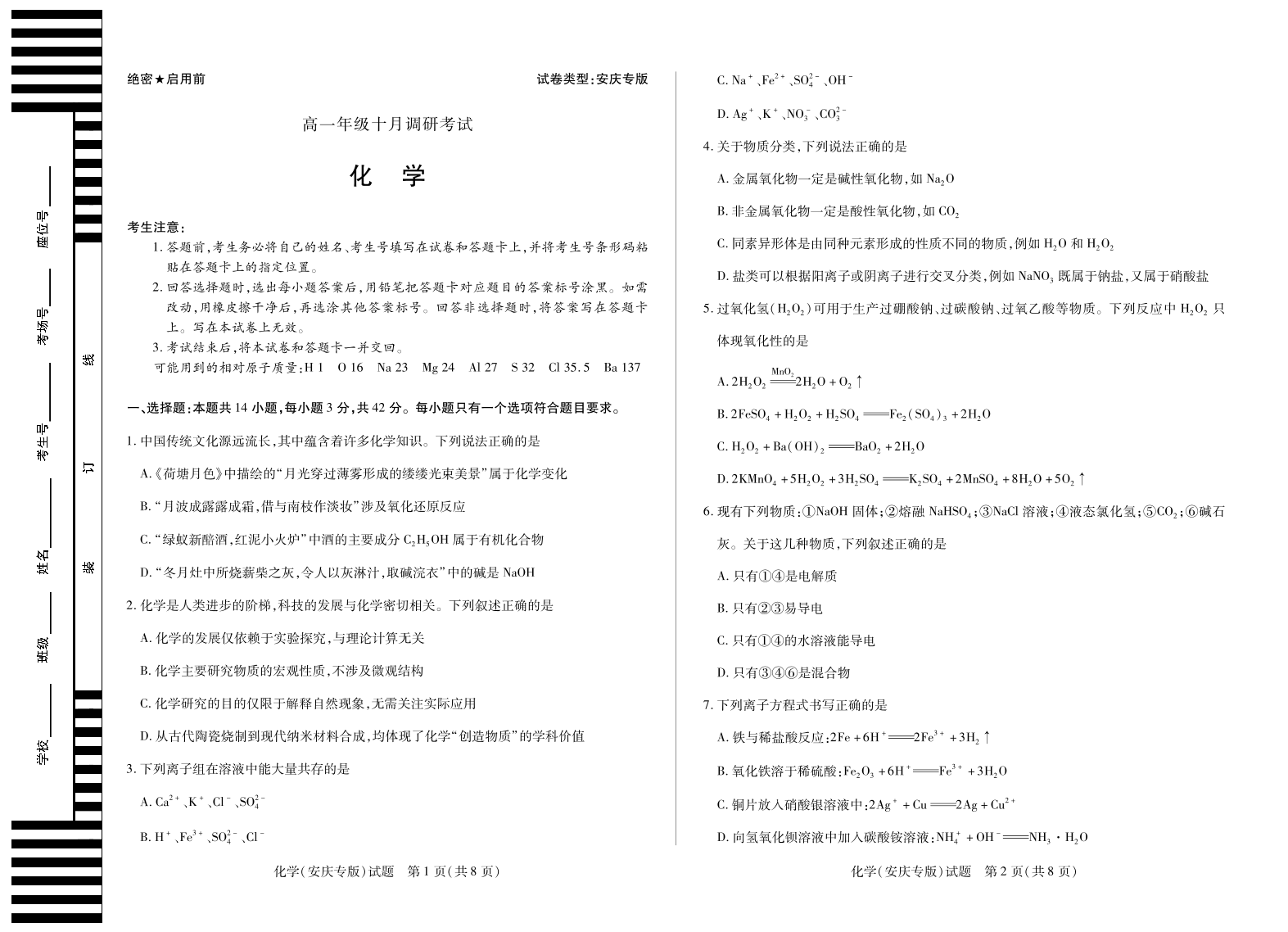 高一化学(安庆专版)--安徽省天一大联考2025-2026学年上学期高一年级10月调研考试