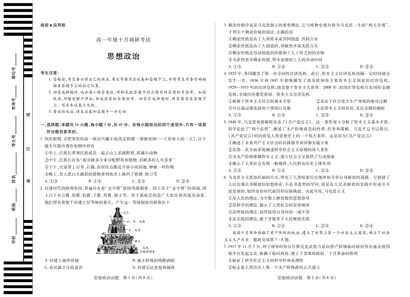 高一政治--安徽省天一大联考2025-2026学年上学期高一年级10月调研考试