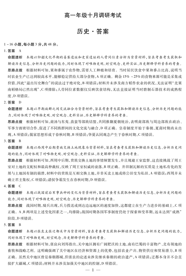 高一历史答案--安徽省天一大联考2025-2026学年上学期高一年级10月调研考试