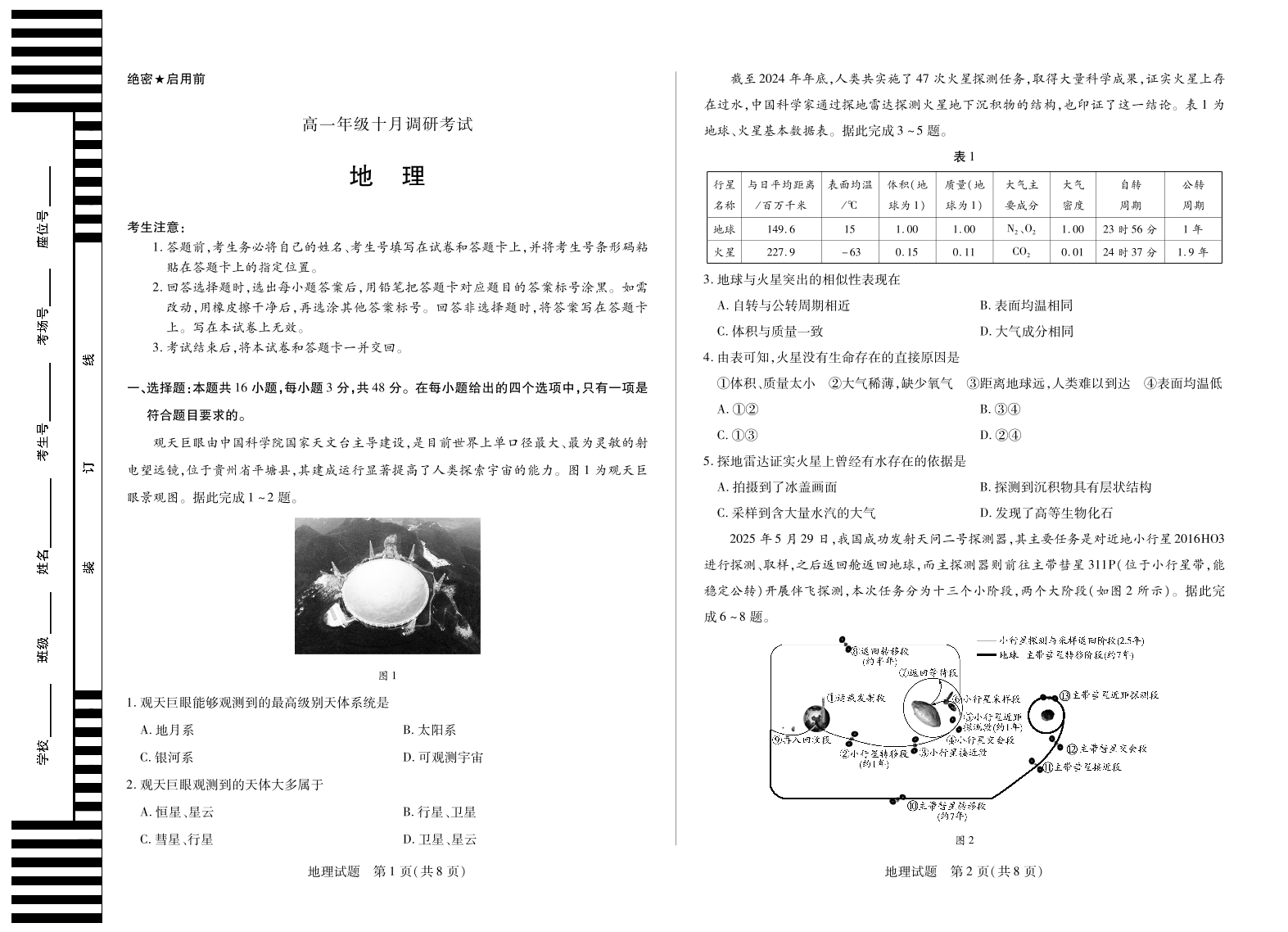 高一地理--安徽省天一大联考2025-2026学年上学期高一年级10月调研考试
