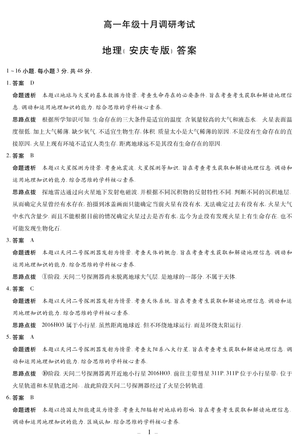 高一地理(安庆专版)答案--安徽省天一大联考2025-2026学年上学期高一年级10月调研考试