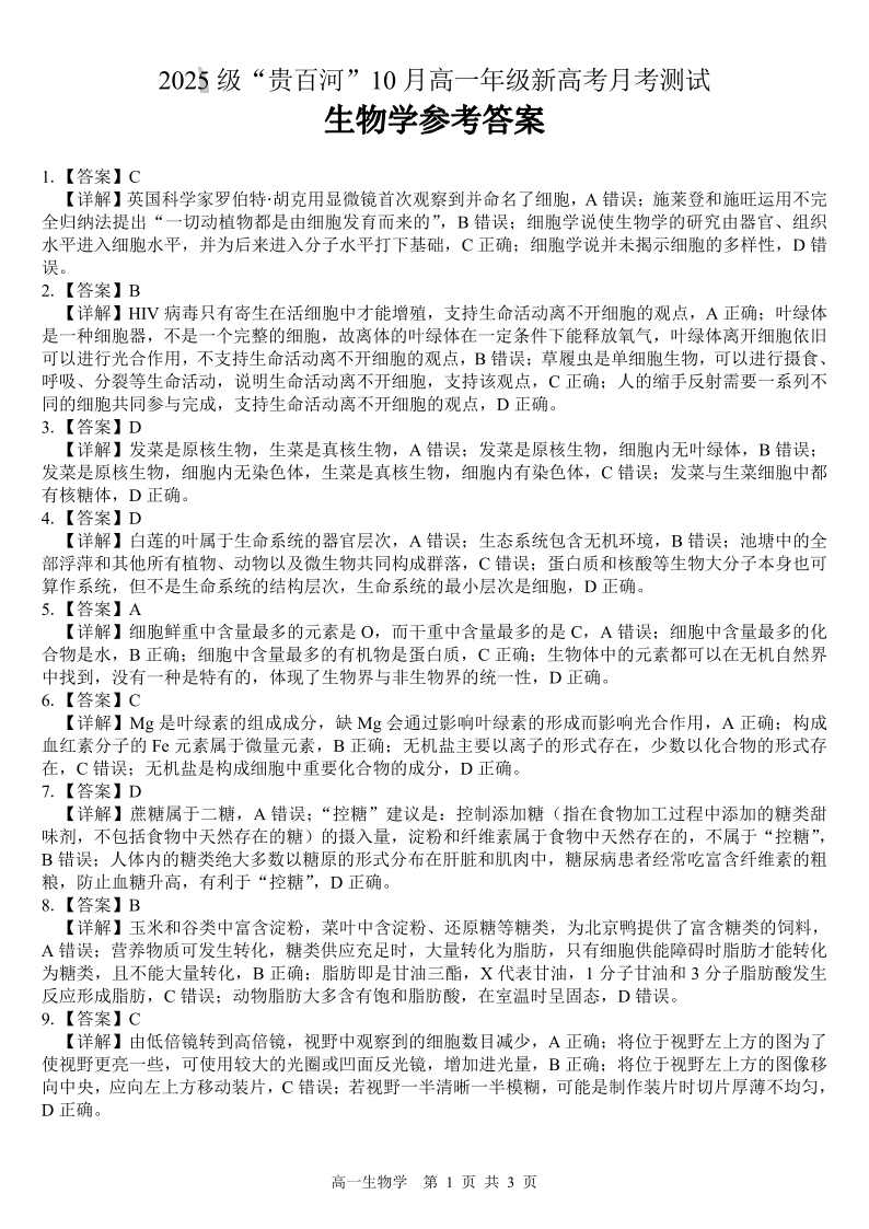 高一生物答案--广西贵百河2025-2026学年高一上学期10月考试卷