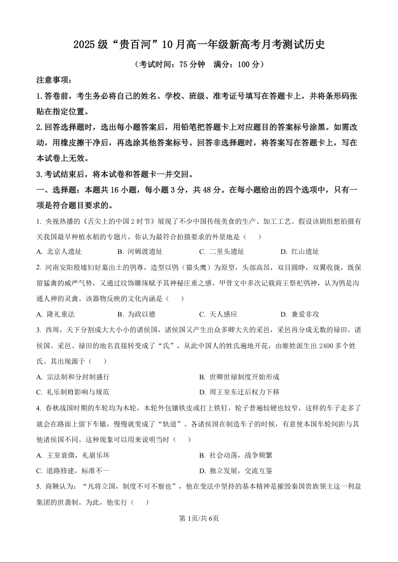 高一历史(原卷版)--广西贵百河2025-2026学年高一上学期10月考试卷