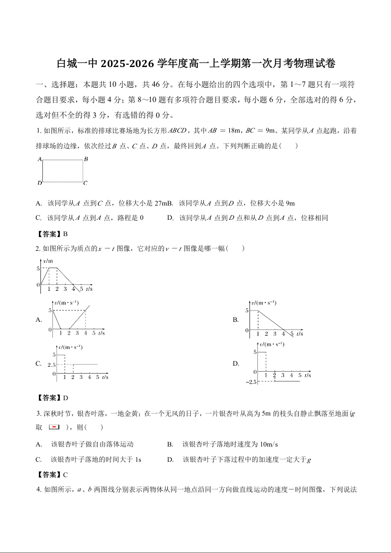 高一物理+答案--吉林省白城市第一中学2025-2026学年高一上学期第一次月考