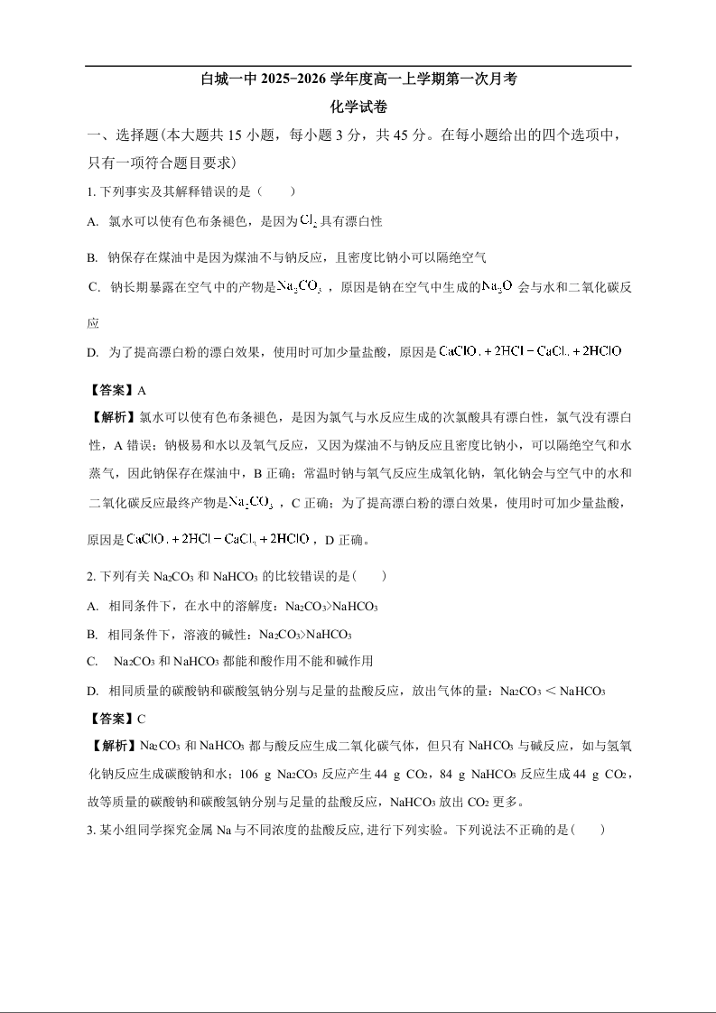 高一化学答案--吉林省白城市第一中学2025-2026学年高一上学期第一次月考
