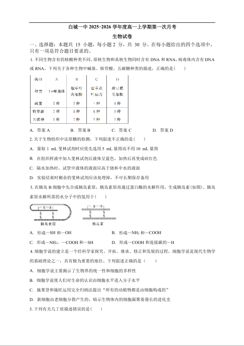 高一生物--吉林省白城市第一中学2025-2026学年高一上学期第一次月考