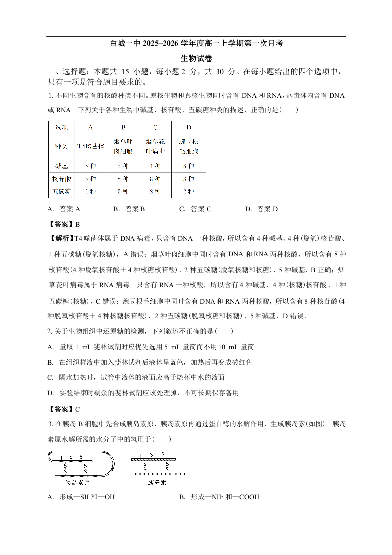 高一生物答案--吉林省白城市第一中学2025-2026学年高一上学期第一次月考