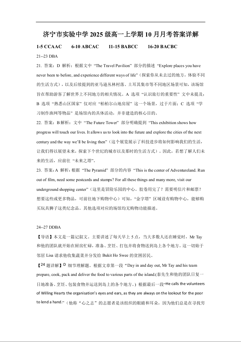 高一英语答案--山东省济宁市实验中学2025-2026学年高一上学期10月月考