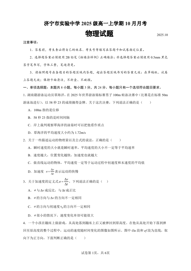 高一物理--山东省济宁市实验中学2025-2026学年高一上学期10月月考