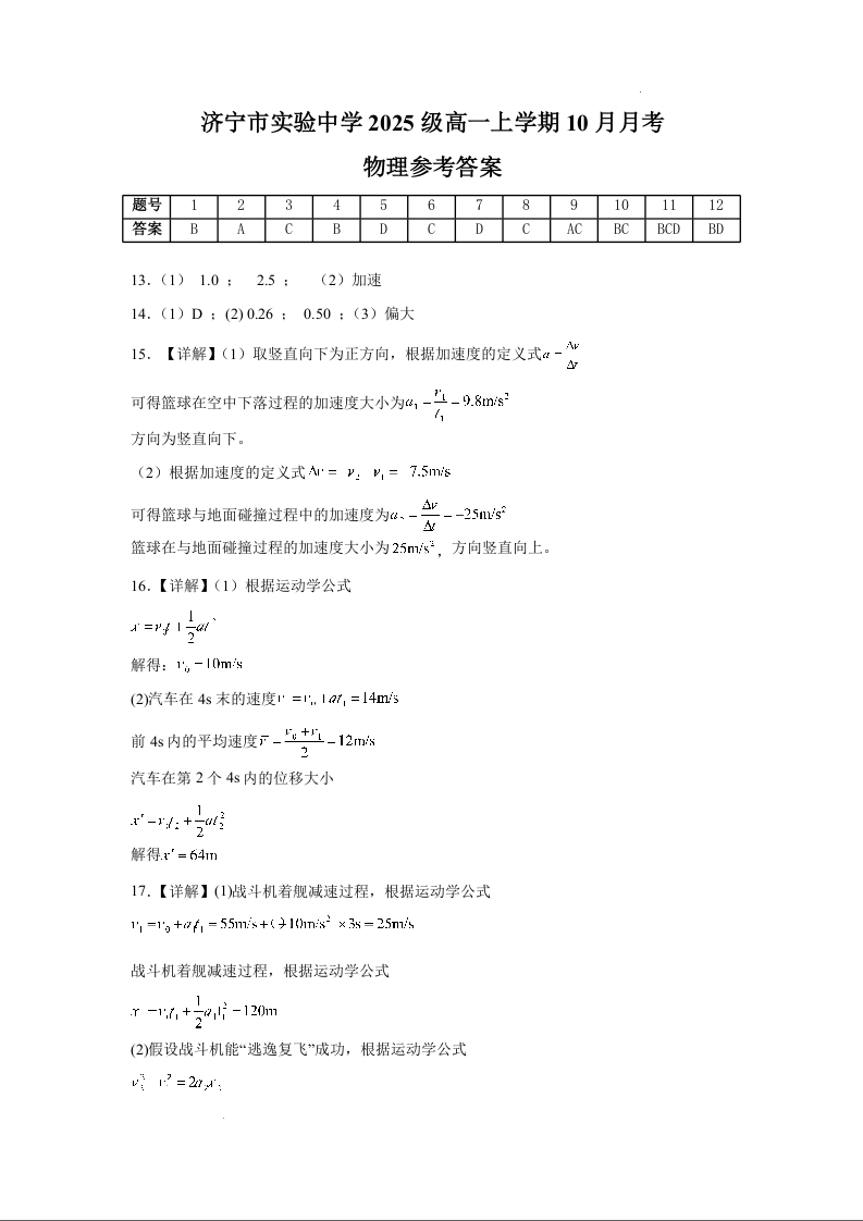 高一物理答案--山东省济宁市实验中学2025-2026学年高一上学期10月月考