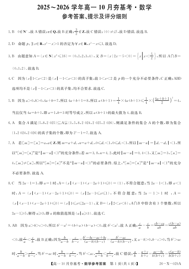 高一数学答案--山西省三晋卓越联盟2025-2026学年高一10月夯基考