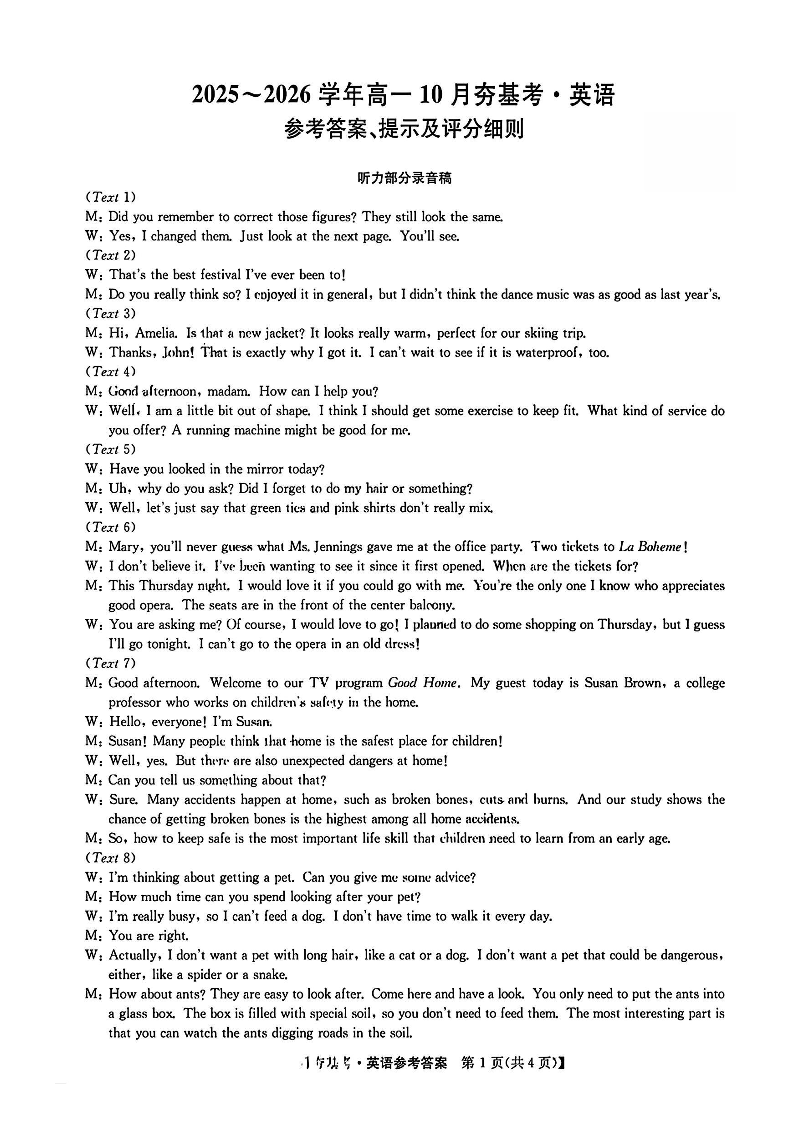 高三英语答案--山西省三晋卓越联盟2025-2026学年高一10月夯基考