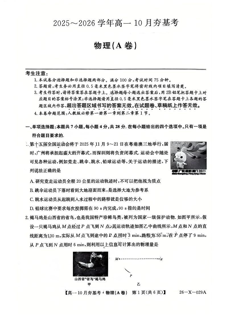 高一物理--山西省三晋卓越联盟2025-2026学年高一10月夯基考