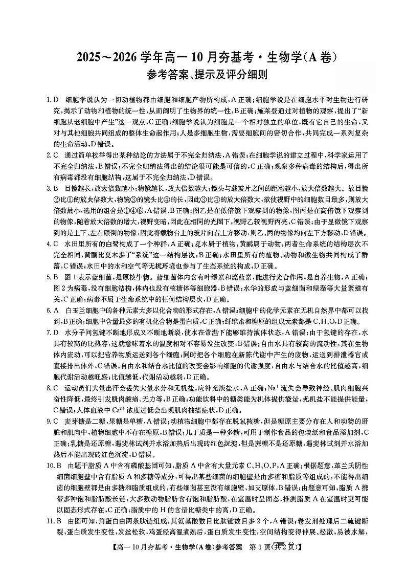 高一生物答案--山西省三晋卓越联盟2025-2026学年高一10月夯基考