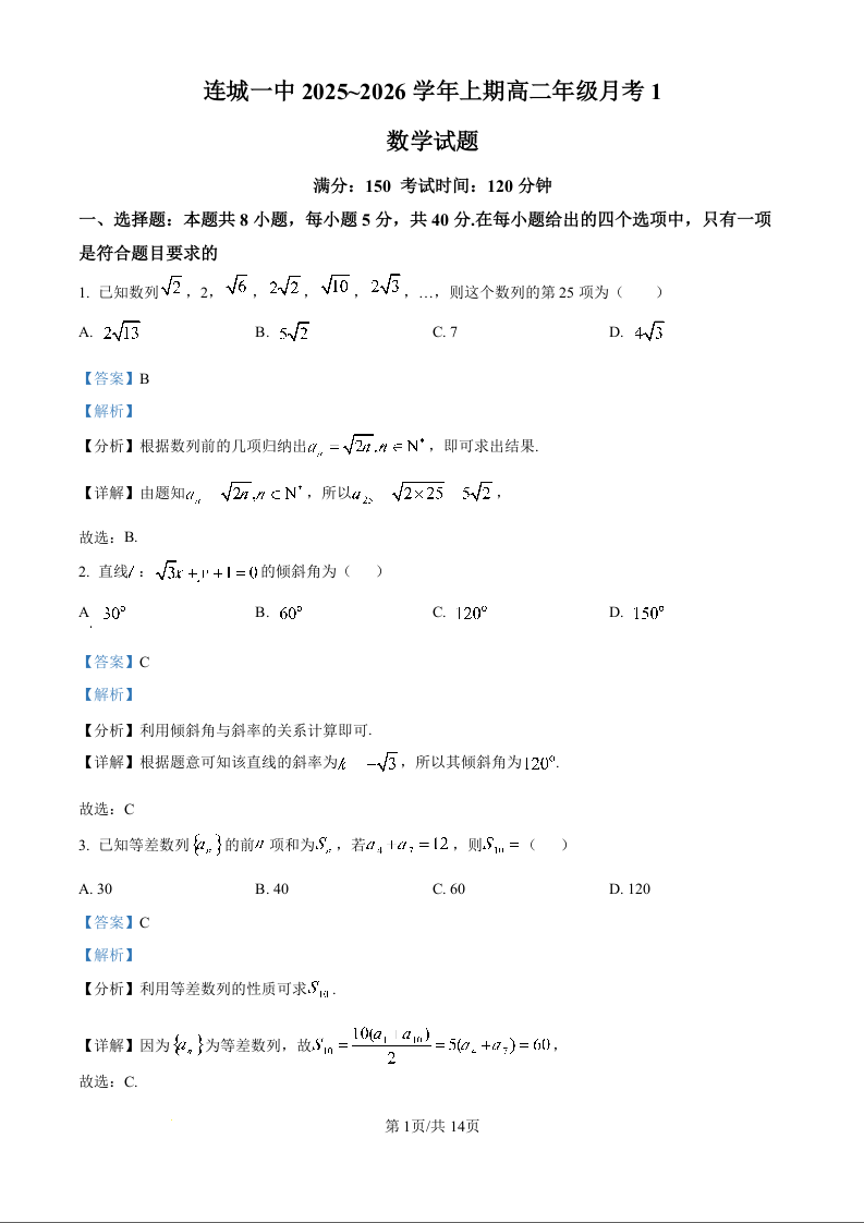 高二数学(精品解析版)--福建省龙岩市连城县第一中学2025-2026学年高二上学期10月月考