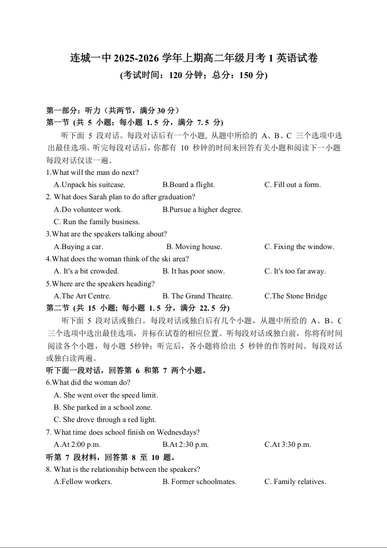 高二英语+答案--福建省龙岩市连城县第一中学2025-2026学年高二上学期10月月考