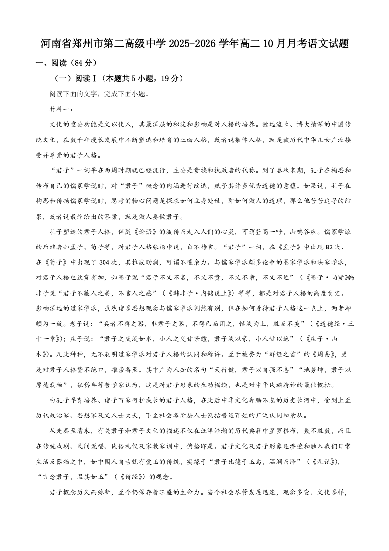 高二语文+答案--河南省郑州市第二高级中学2025-2026学年高二上学期10月月考
