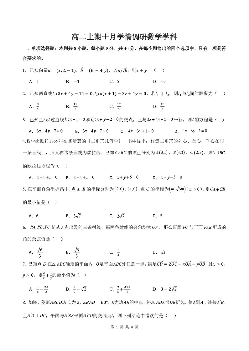 高二数学--河南省郑州市第二高级中学2025-2026学年高二上学期10月月考