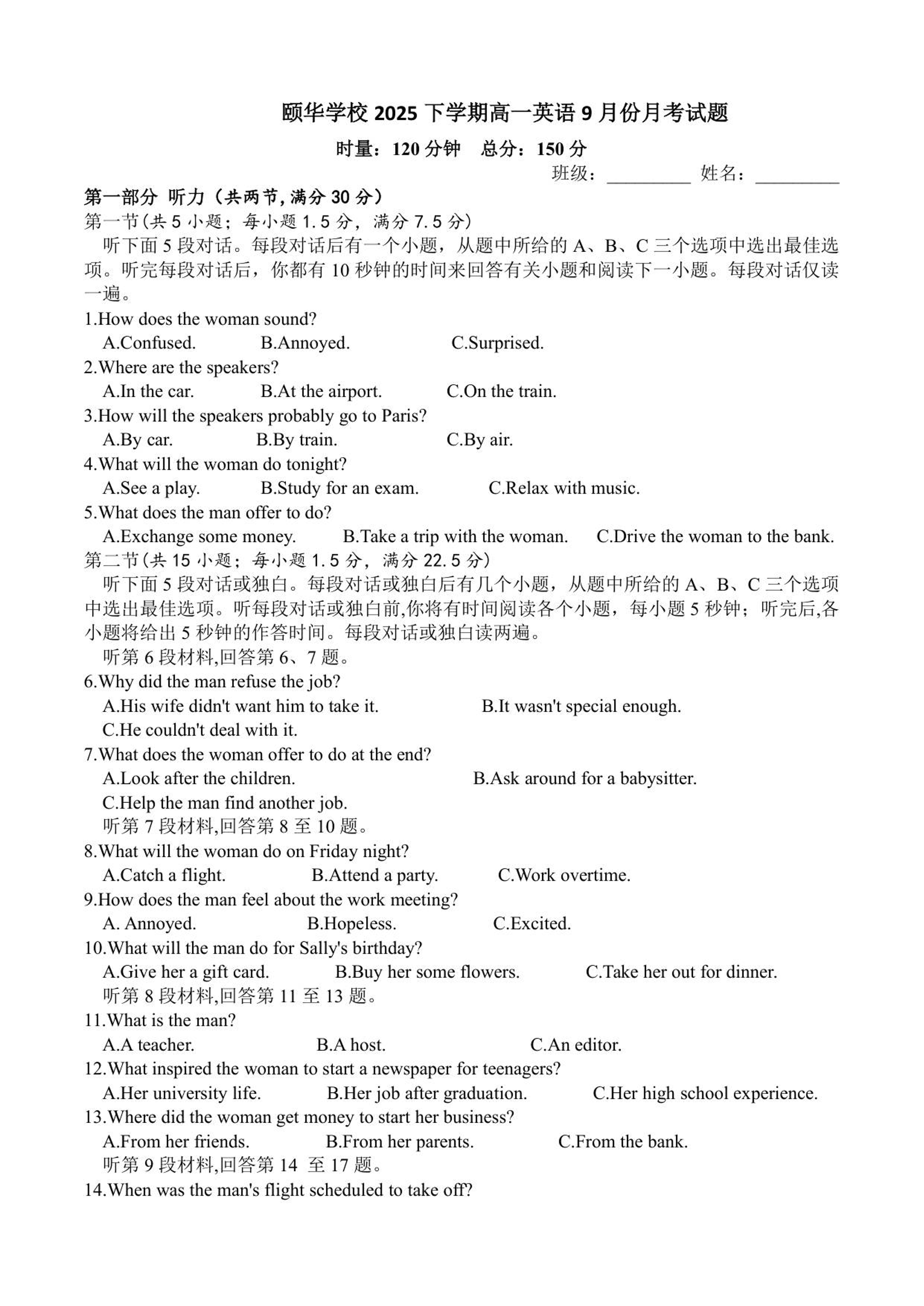高一英语--湖南省岳阳市颐华高级中学(平江)2025-2026学年高一上学期第一次月考
